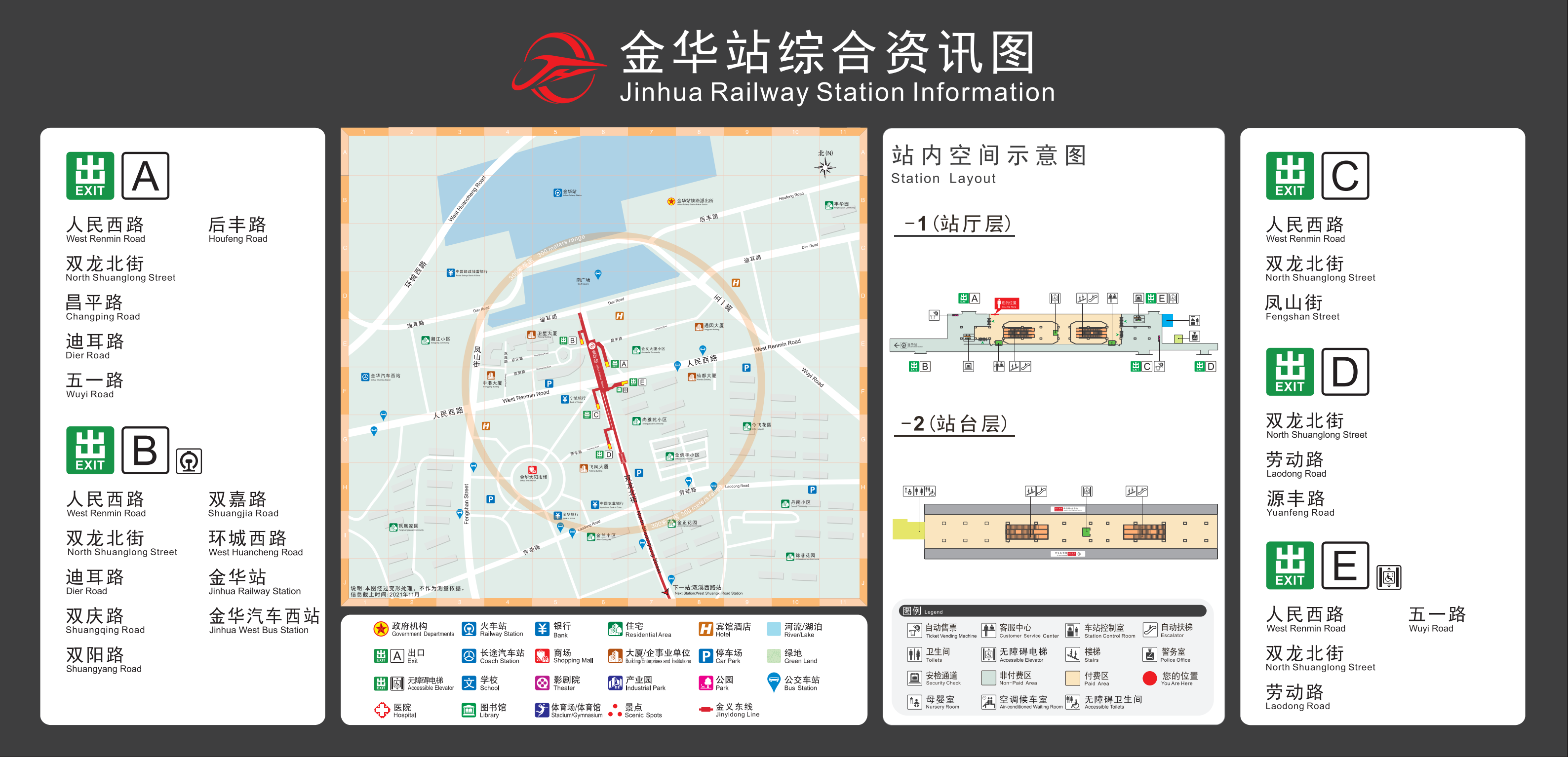 • 國鐵換乘通道  公交站名: 金華火車站  B3、B5、金蘭快線、金武快線、B5夜、金蘭夜D8、J12、11、15支、19、24、37、55、55支、330、57、510、510支、523、527、527支、528、705、808